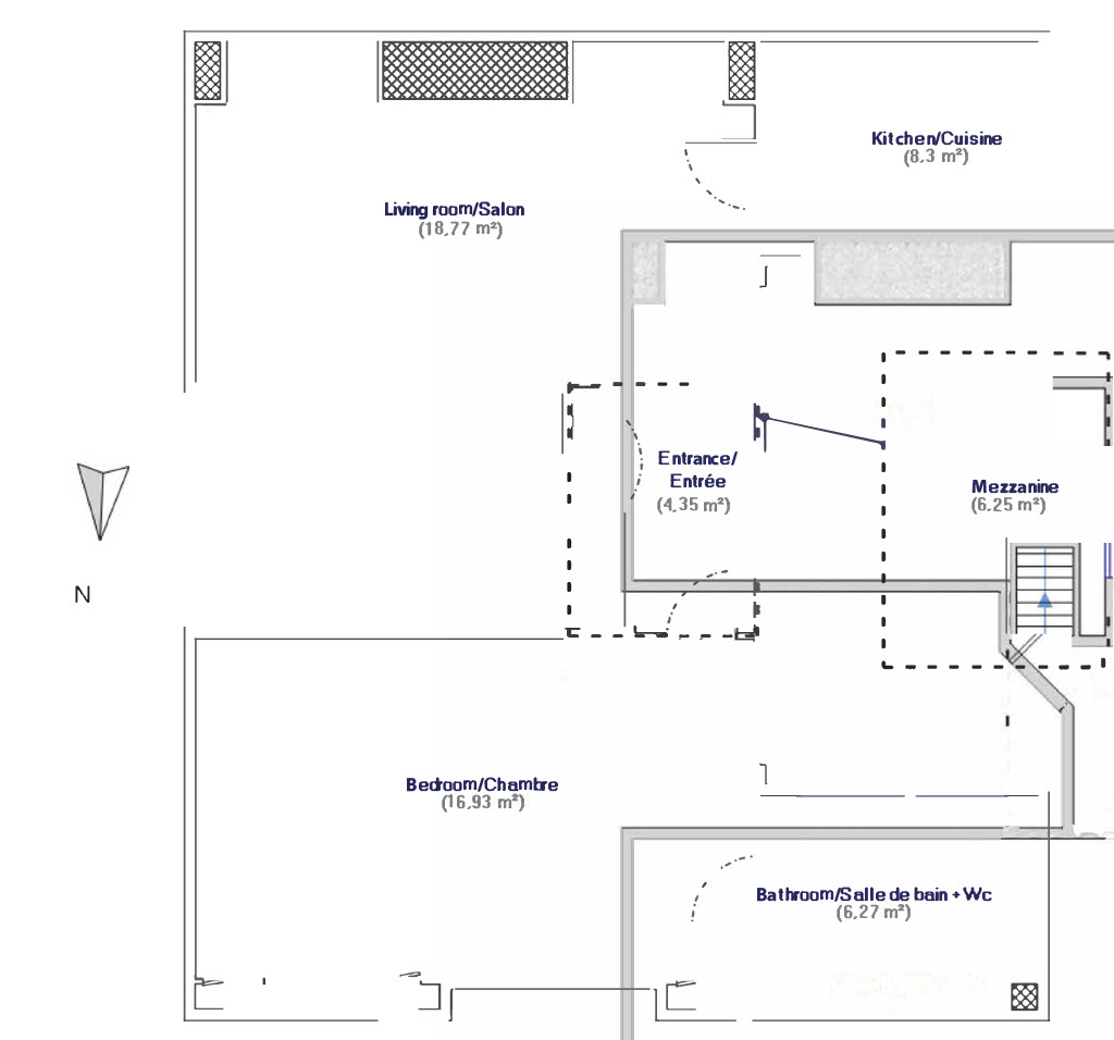 Above, a mezzanine-style space provides valuable additional surface area — perfect for storage, a reading nook, or a creative retreat — without compromising the elegance of the main rooms.