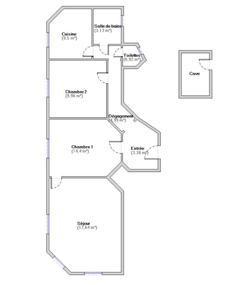L’agencement comprend actuellement une entrée, un salon lumineux avec trois fenêtres, une salle à manger pouvant facilement être transformée en seconde chambre, une cuisine indépendante, une salle de bains ainsi que des toilettes séparées.